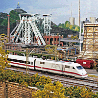 Der Deutschland Express Mitten im Herzen des Ruhrgebietes, in Gelsenkirchen, am Fuße des Förderturmes der Zeche Nordstern, steht die renovierte Halle der ehemaligen Zeche. In diesen Räumlichkeiten befindet sich seit dem 30.April 1999 eine der größten computergesteuerten Märklin Modelleisenbahnen. Die ganzjährig geöffnete Anlage ist das Erlebnis für Jung und Alt. Auf einer Deutschland Reise von der Nordsee mit Strand und Hafenanlagen, geht es über weite Strecken mit großzügig angelegten Bahnhöfen und Großstädten, durch Rheintäler, vorbei an Binnenhäfen bis zum Bodensee. Von hier aus geht es weiter durch Schluchten, über große Brücken bis in die Schweiz, natürlich mit vorbildlichem Linksverkehr. Besonderes Augenmerk wurde auf die Gestaltung von Bahnbetriebswerken, Industrieanlagen und der bunt beleuchteten Kirmes gelegt. Viele Gebäude und Bauwerke entstanden nach bekannten Vorbildern, genau wie die liebevoll gestalteten Details, die alle ihren Ursprung beim großen Vorbild haben. Auf der 700qm großen Anlage, die mit 20 Schattenbahnhöfen ausgestattet ist, verkehren mehr als 200 verschiedene Personen- und Güterzüge auf 4100m Gleisen. Technik die Begeistert. Natürlich stehen für unsere kleinen Besucher zwei Märklin Maxi Anlagen bereit, die nach Herzenslust befahren werden dürfen. Auch das eigene Kinderkino lädt zum Unterhalten und Pausieren ein. Im direkten Umfeld befinden sich ausgedehnte Parkanlagen des Bundesgartenschau-Geländes und Gastronomie. Ein Ausflug für die ganze Familie, das Herzen höher schlagen läßt. Weitere Infos: Die Modelleisenbahnanlage ist im Maßstab H0 (Halb Null 1:87) 87 mal kleiner als das große Vorbild gebaut worden. Die Eisenbahnfahrzeuge sind fast alle vom Göppinger Traditionshersteller Märklin und werden mit Wechselstrom digital / Motorola-Format betrieben. Alle Fahrzeuge besitzen einen eingebauten Digital-Decoder und werden von 19 unanhängigen Computern gesteuert. Auch die PKW-Modelle, Gebäude und Figuren sind im Maßstab 1:87. Ganz aktuell wird besitzt die Anlage einen Tag- Nachtbetrieb, das Licht wird alle 20min langsam heruntergeregelt und die Modellbahnbeleuchtung (Häuser, Straßenlaternen, Autolicht) für 5min eingeschaltet bis zum erneuten Sonnenaufgang. An der Anlagenkante befinden sich diverse Druckknöpfe / Taster, mit denen man verschiedene Geräusche, Licht- und Bewegungseffekte auslösen kann. Auch kann man sich kostenlos kindgerechte kleine Trittleitern leihen, mit denen Kinder über den Rand der ca. 1,10 m hohen Anlagenkante schauen kann. Im Kassenbereich befindet sich ein Modellbahnshop, hier kann man aus dem großen Angebot von Märklin von der Startpackung über Lokomotiven bis hin zum Wagen alles erwerben. Kostenlose und kompetente Beratung zum digitalen und analogen Modellbahnbetrieb. Weitere und jeweils aktuelle Infos zum ?Der Deutschland Express? entnehmen Sie bitte der hompage, dort sind immer die aktuell gültigen Preise und Öffnungszeiten aufgezeigt! |